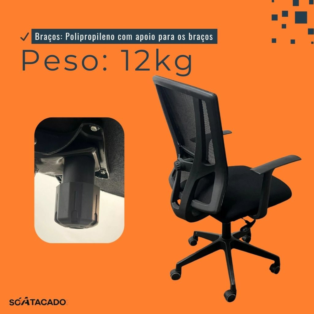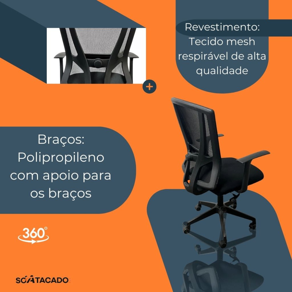 - Encosto em tela mesh: Favorece a ventilação e evita o acúmulo de calor