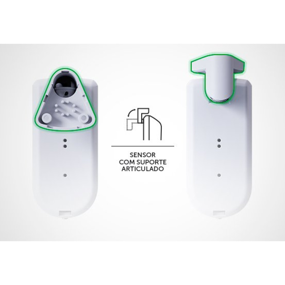 Possui suporte articulado com ajuste fino na horizontal, proporcionando maior facilidade na instalação e posicionamento ideal para detecção.